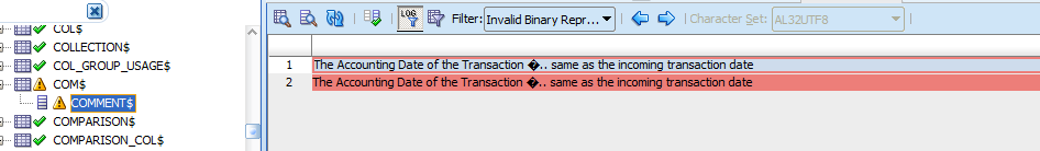 Using MDU tool ( Database  Migration Assistant for Unicode ) to scan database Dictionary Objects, we can see the problem data is from SYS.COM$.