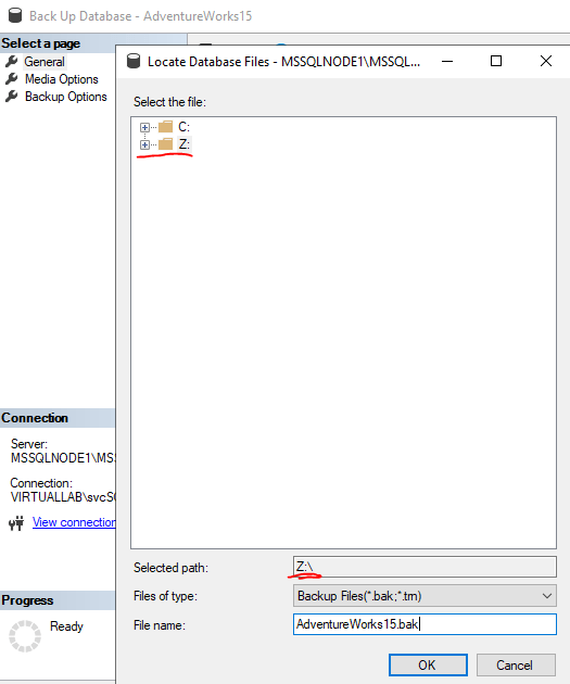 BACKUP DATABASE [AdventureWorks15] TO DISK = N'Z:\AdventureWorks15.bak'