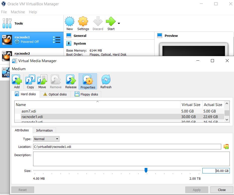 We have two Linux hosts of Oracle RAC in Oracle VirtualBox. Due to space shortage for file systems, there are difficulties for GI/RAC upgrading and patching. we have to extend the virtual hard disk from 30GB to 45GB, then extend the file system size accordingly.